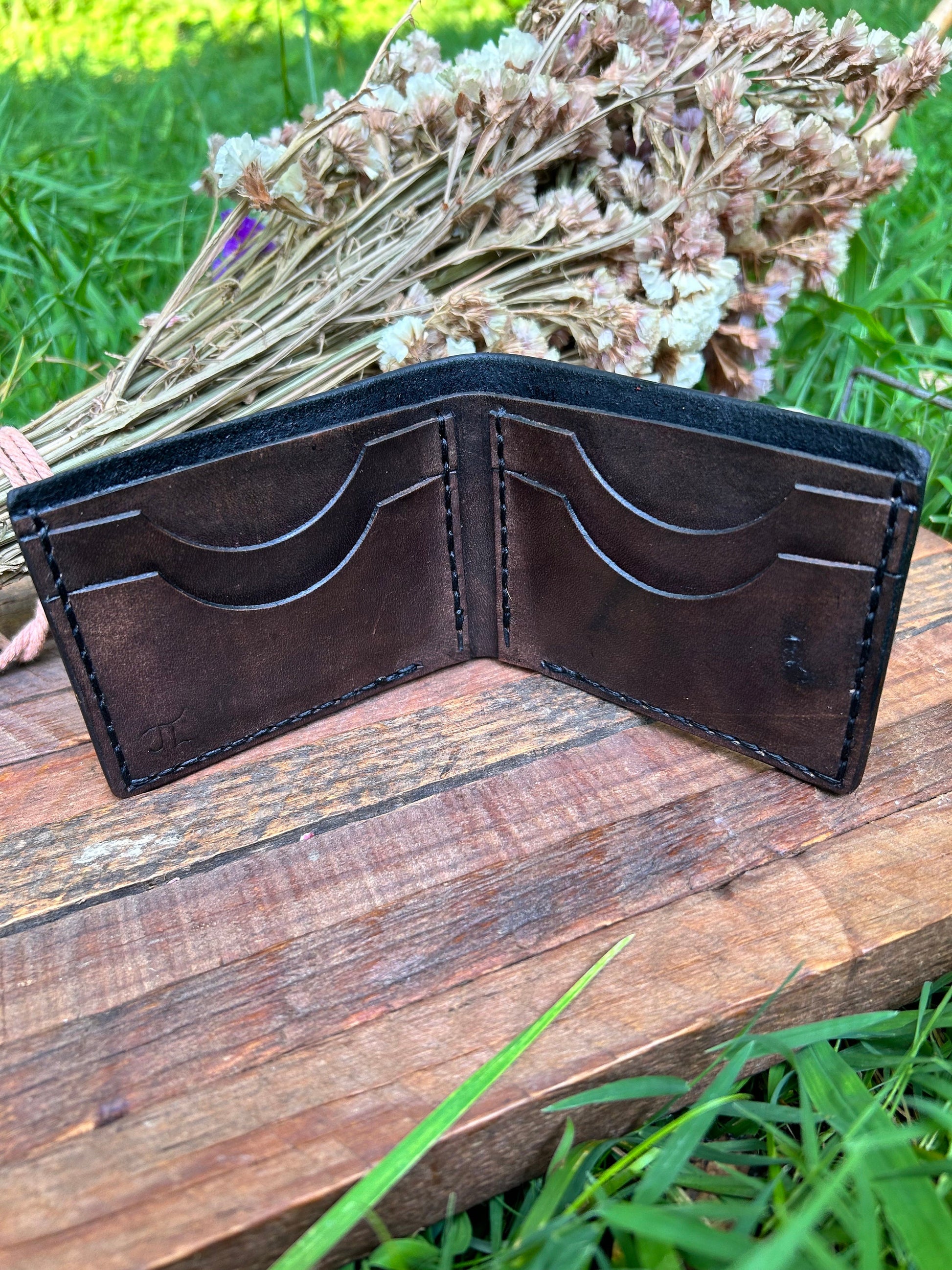 This is a quality, hand tooled, hand stitched bifold wallet. Made from durable full grain cowhide leather.