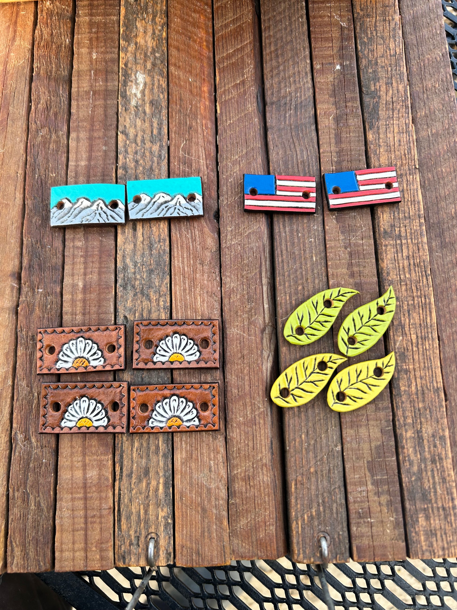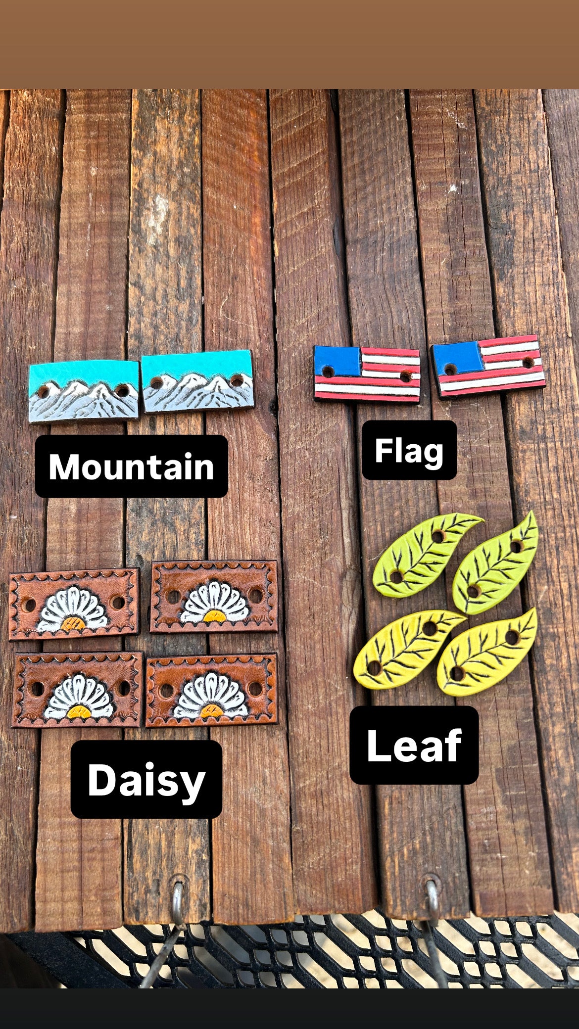 These are hand tooled and hand painted on full grain leather. Feel free to mix and match, if I don’t have what you want go to the ‘boot charms’ page and place an (made-to-order) order!