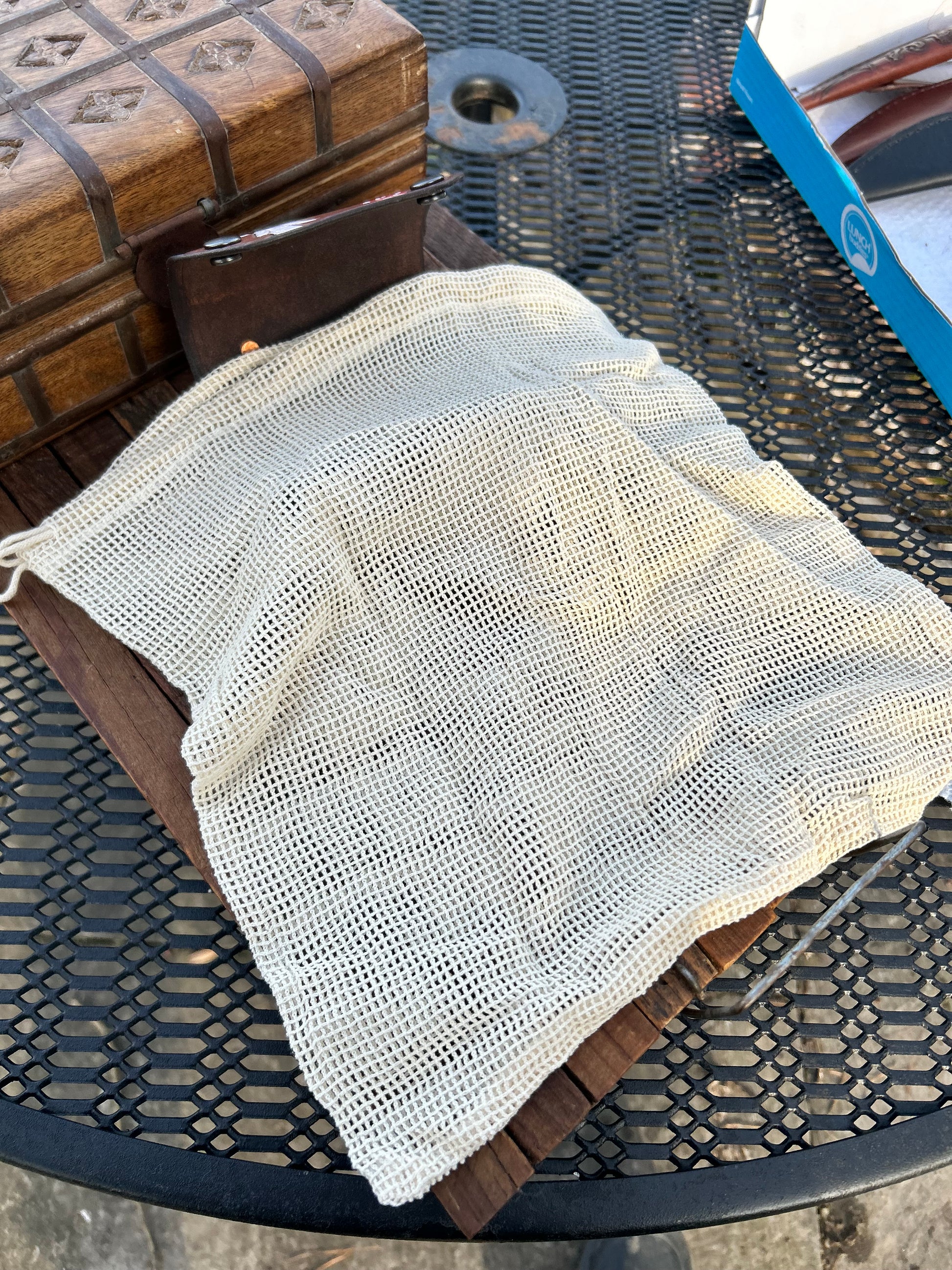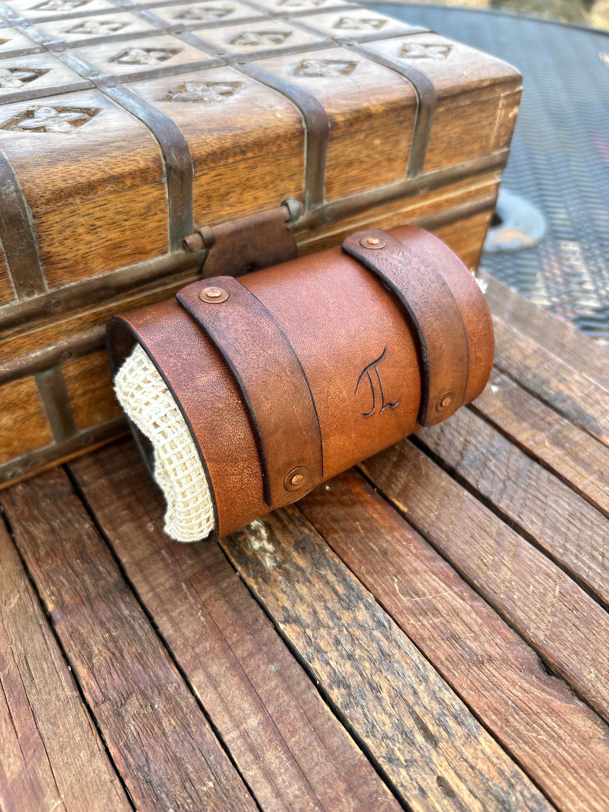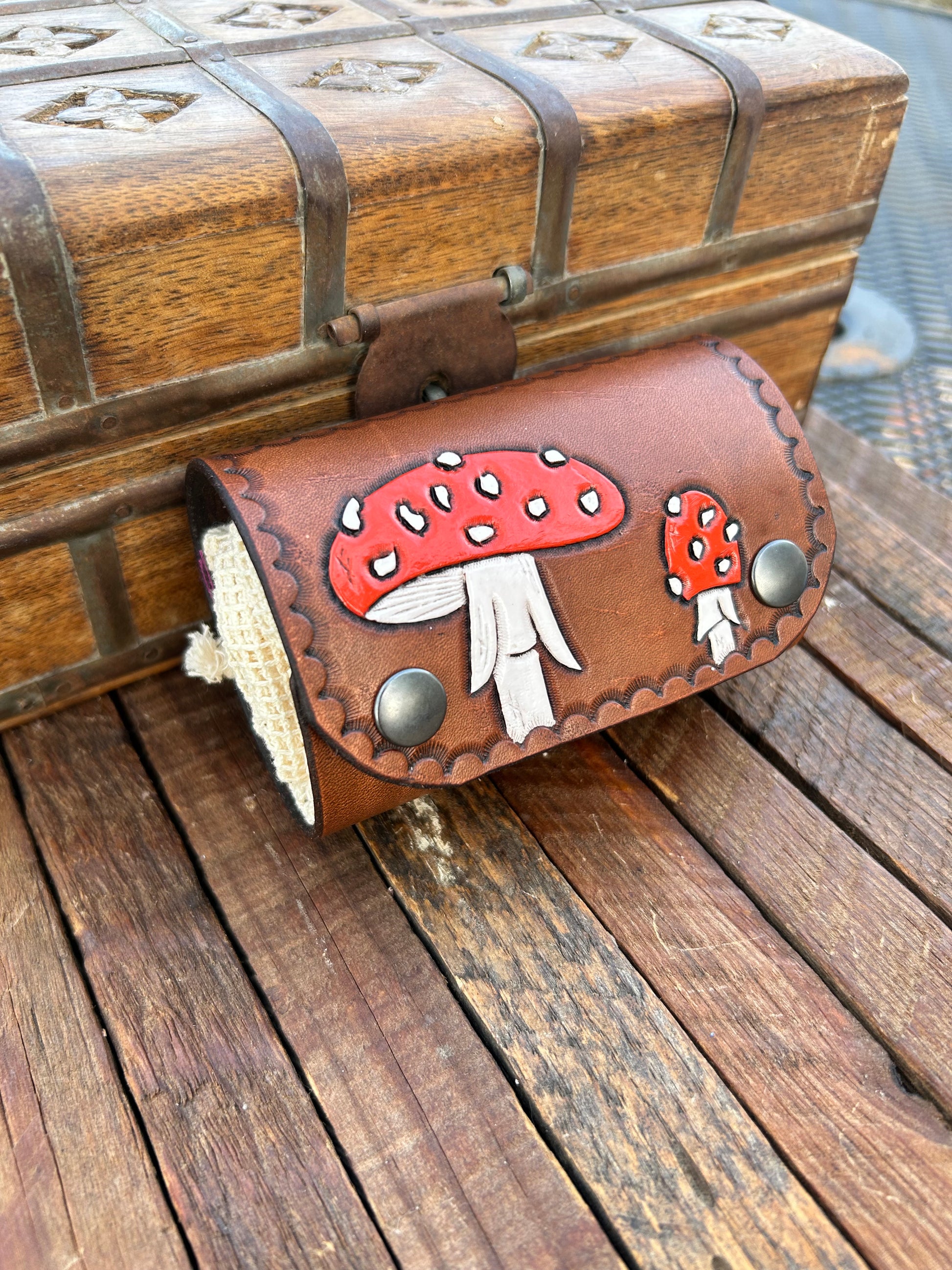 These foraging bags are cotton, wrapped and snapped inside of hand tooled and hand painted full grain leather. The cotton bag is held by 2 strong snaps & is easily detached from the leather for hand washing. (These bags are meant to hold plants/mushrooms & are not intended for heavy weight-rocks, shells, etc)