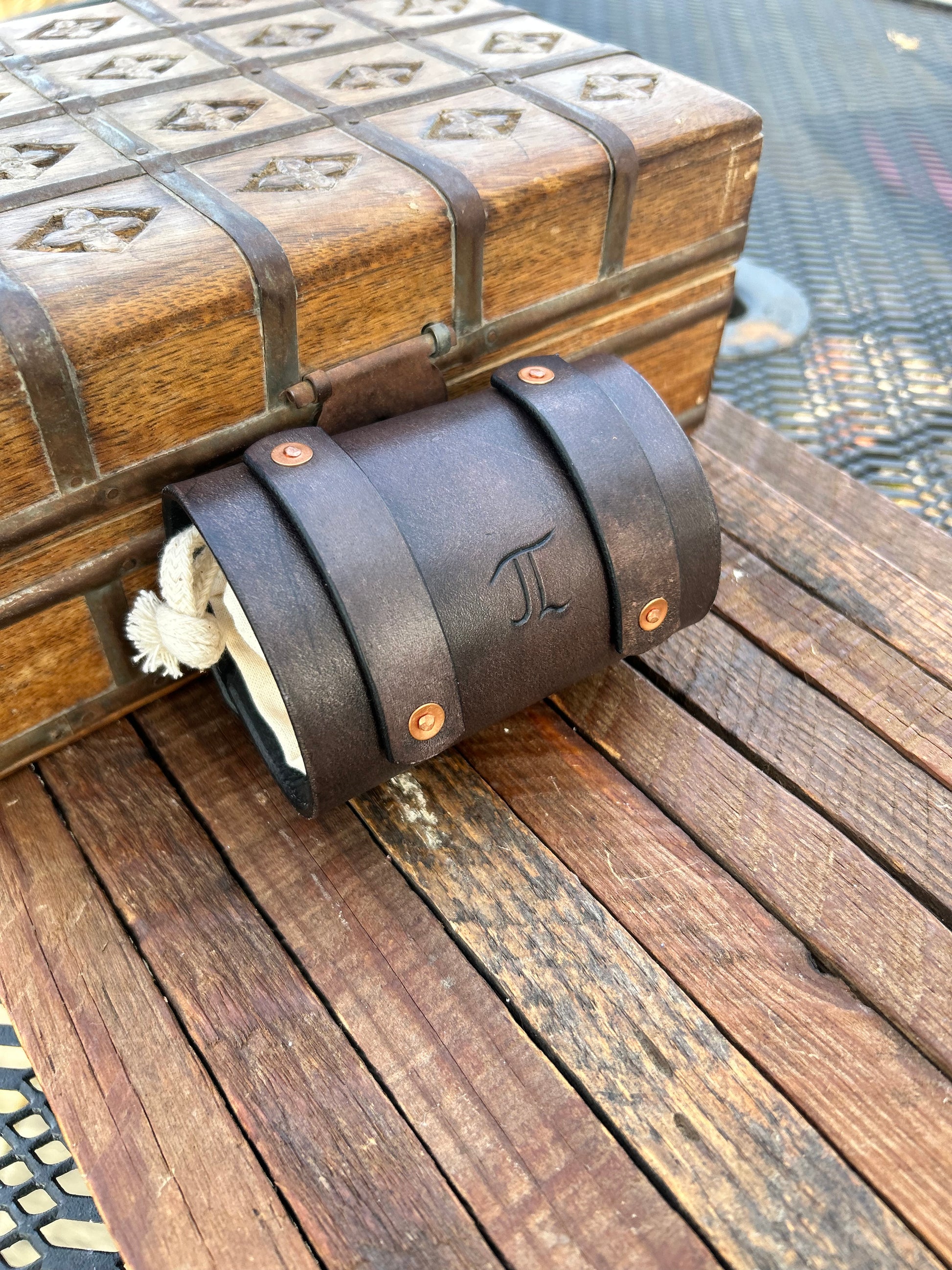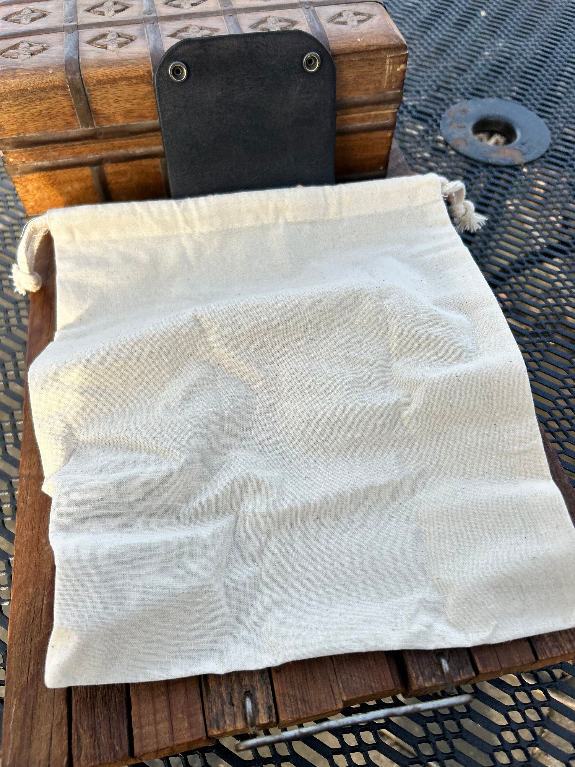 These foraging bags are cotton, wrapped and snapped inside of hand tooled and hand painted full grain leather. The cotton bag is held by 2 strong snaps & is easily detached from the leather for hand washing. (These bags are meant to hold plants/mushrooms & are not intended for heavy weight-rocks, shells, etc)