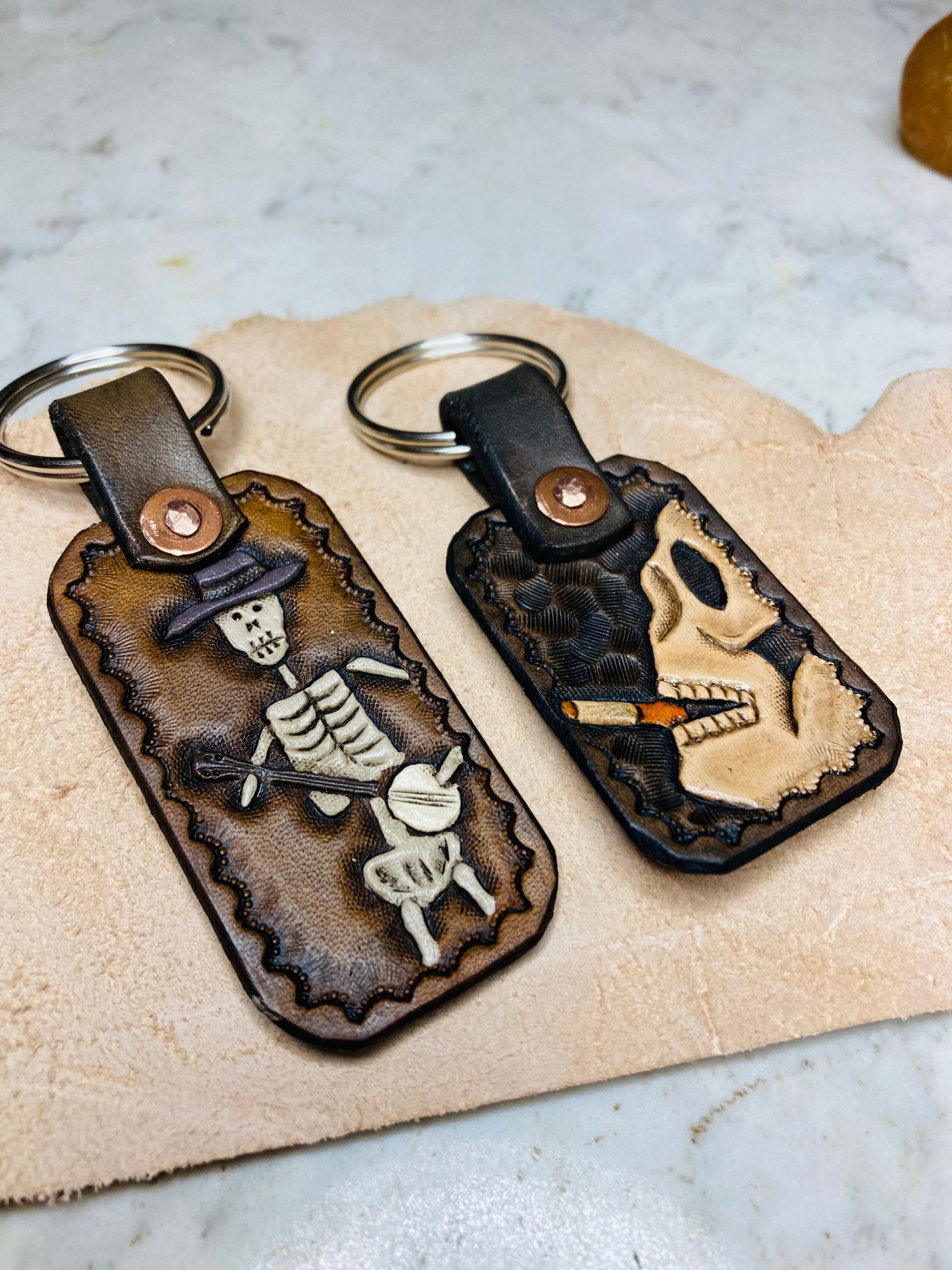 These little dead guys are hand tooled on full grain leather, they are hand painted, lightweight, and strong! Choose between smoking skull, or skeleton banjo.