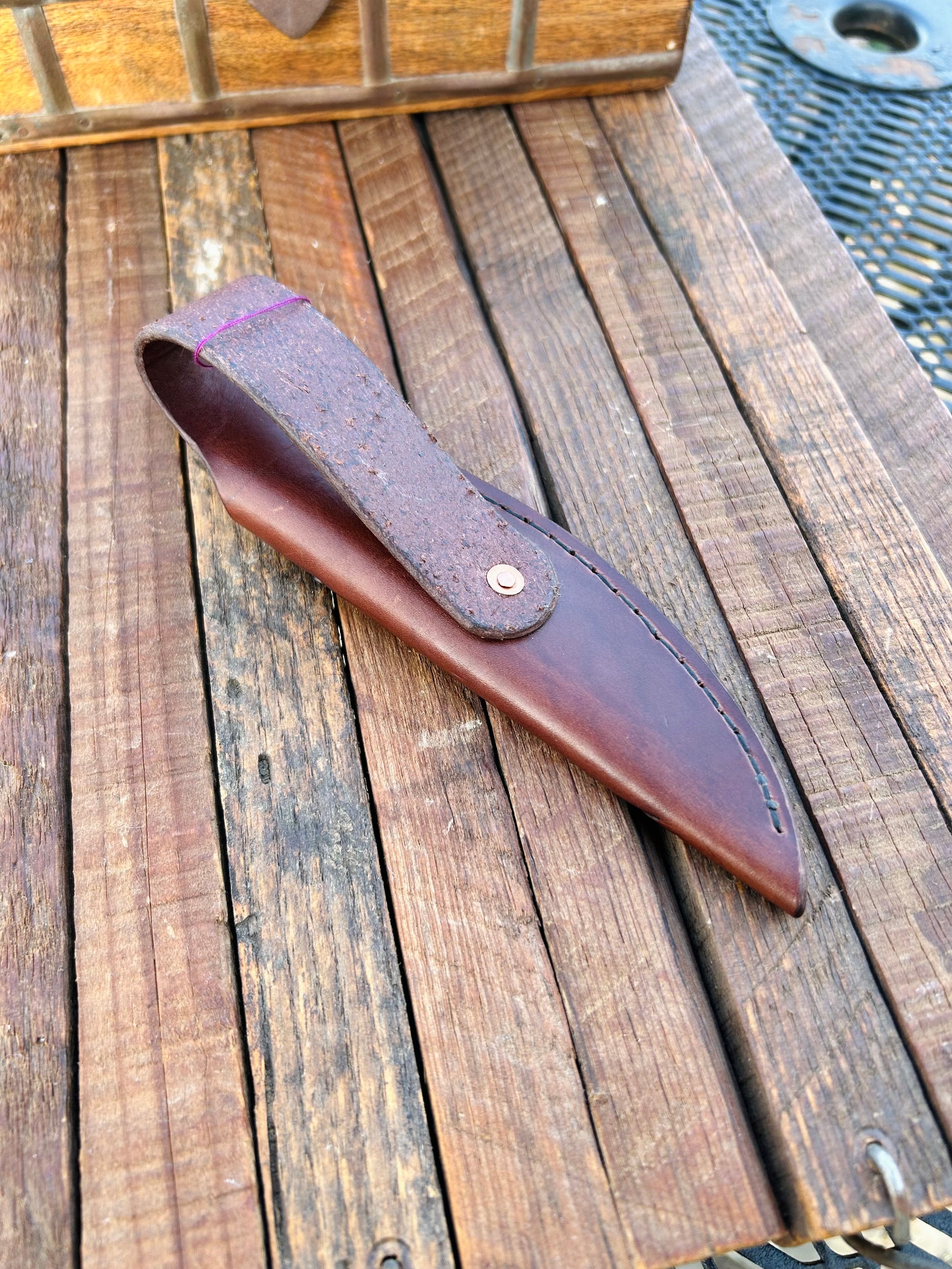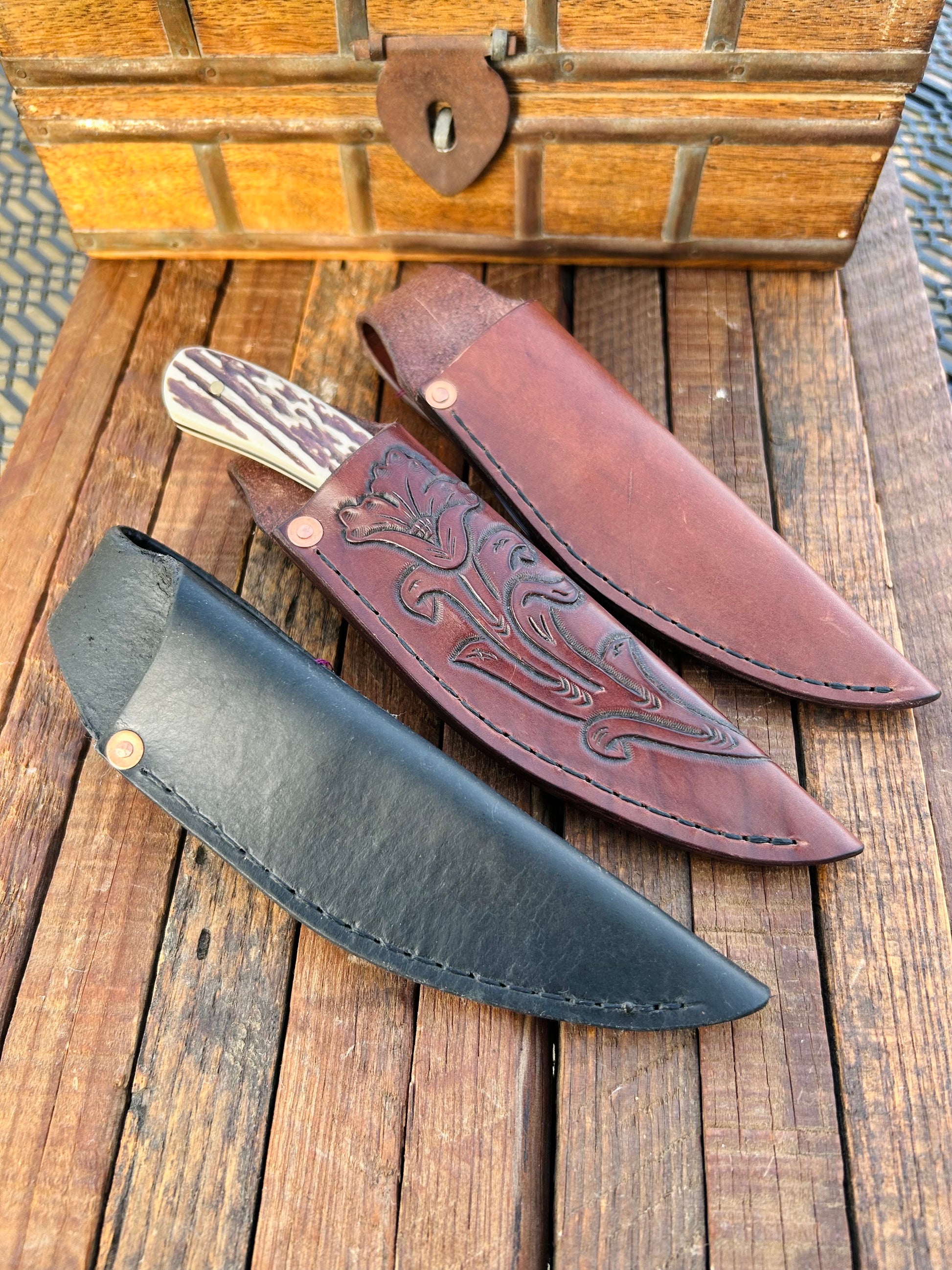 Hand tooled and hand stitched knife sheaths made from full grain vegetable tanned leather. Reinforced with welt layer and copper rivet to prevent cutting through stitches.