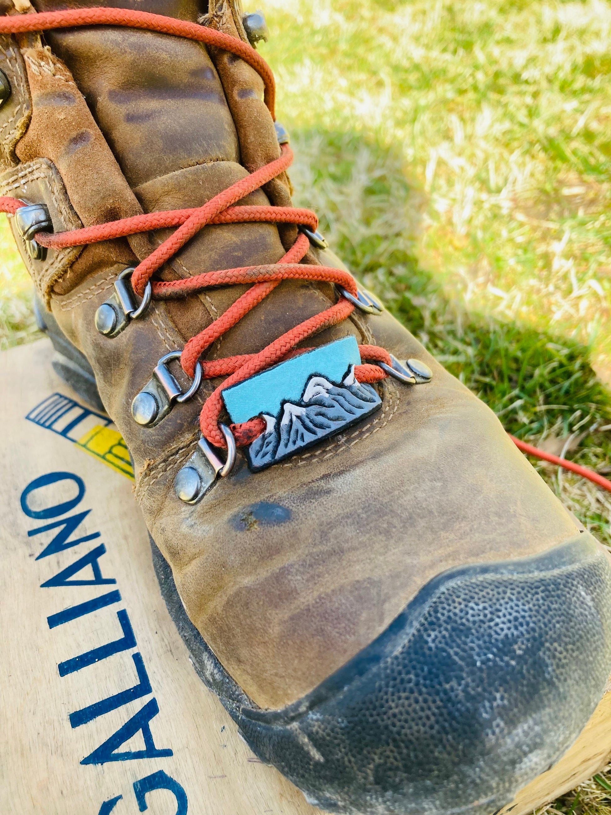 These boot charms are hand tooled and hand painted! Choose between snowy mt, brown/orange mt.