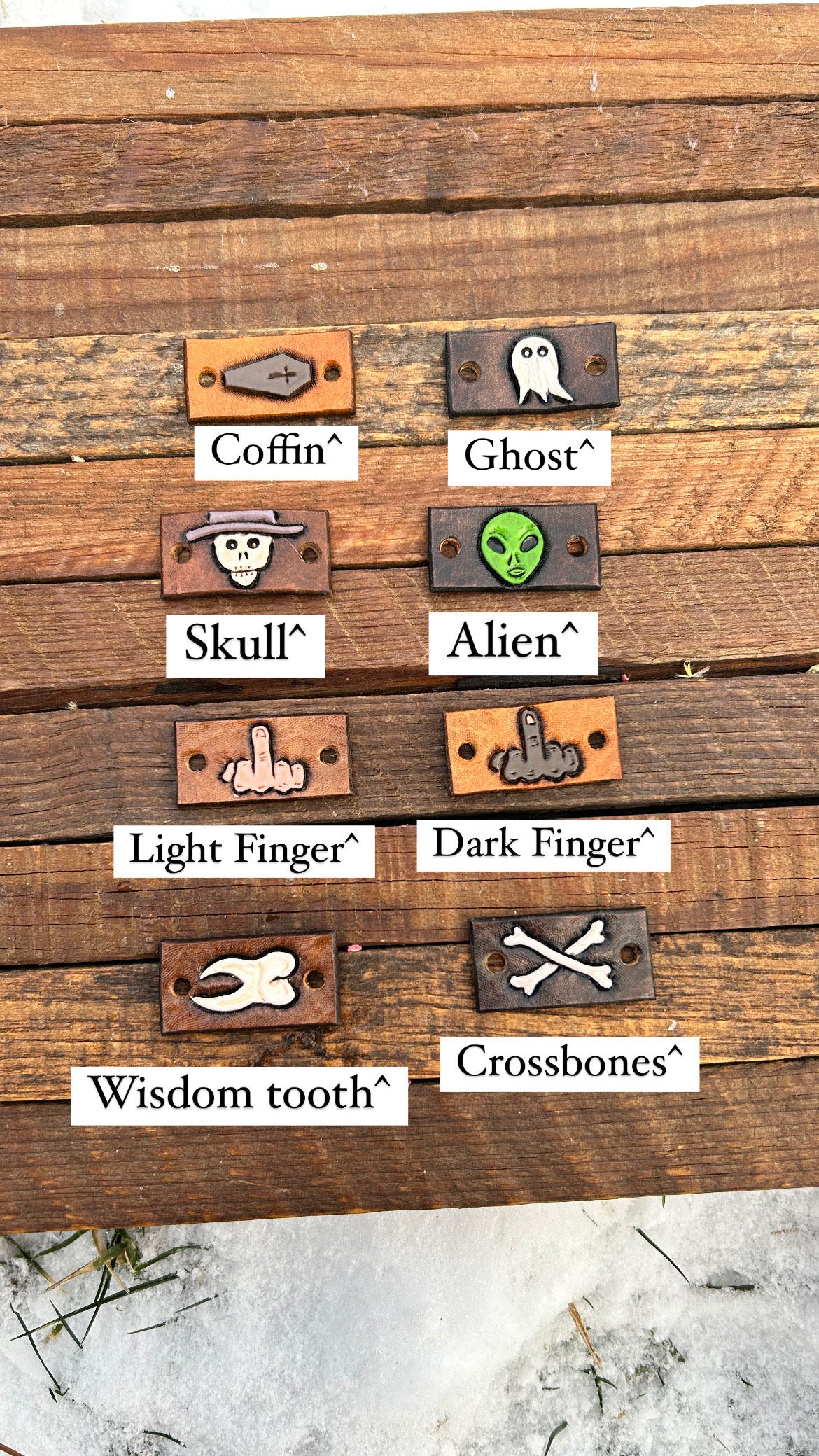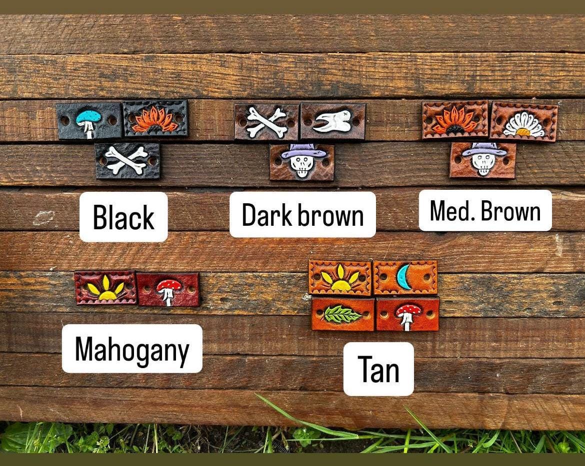 These little beauties are hand tooled and hand painted on full grain leather. Hand crafted in Indiana. Each purchase includes 1 lacelet. Choose your own style & color! These are individually hand painted by mixing paints & hand tooled. Please allow slight color variation & slight differences. (These are not stamped with one large stamp) These are made to order and will ship in 5-10 business days! To see how leather is carved & tooled follow my insta @j_t_leather
