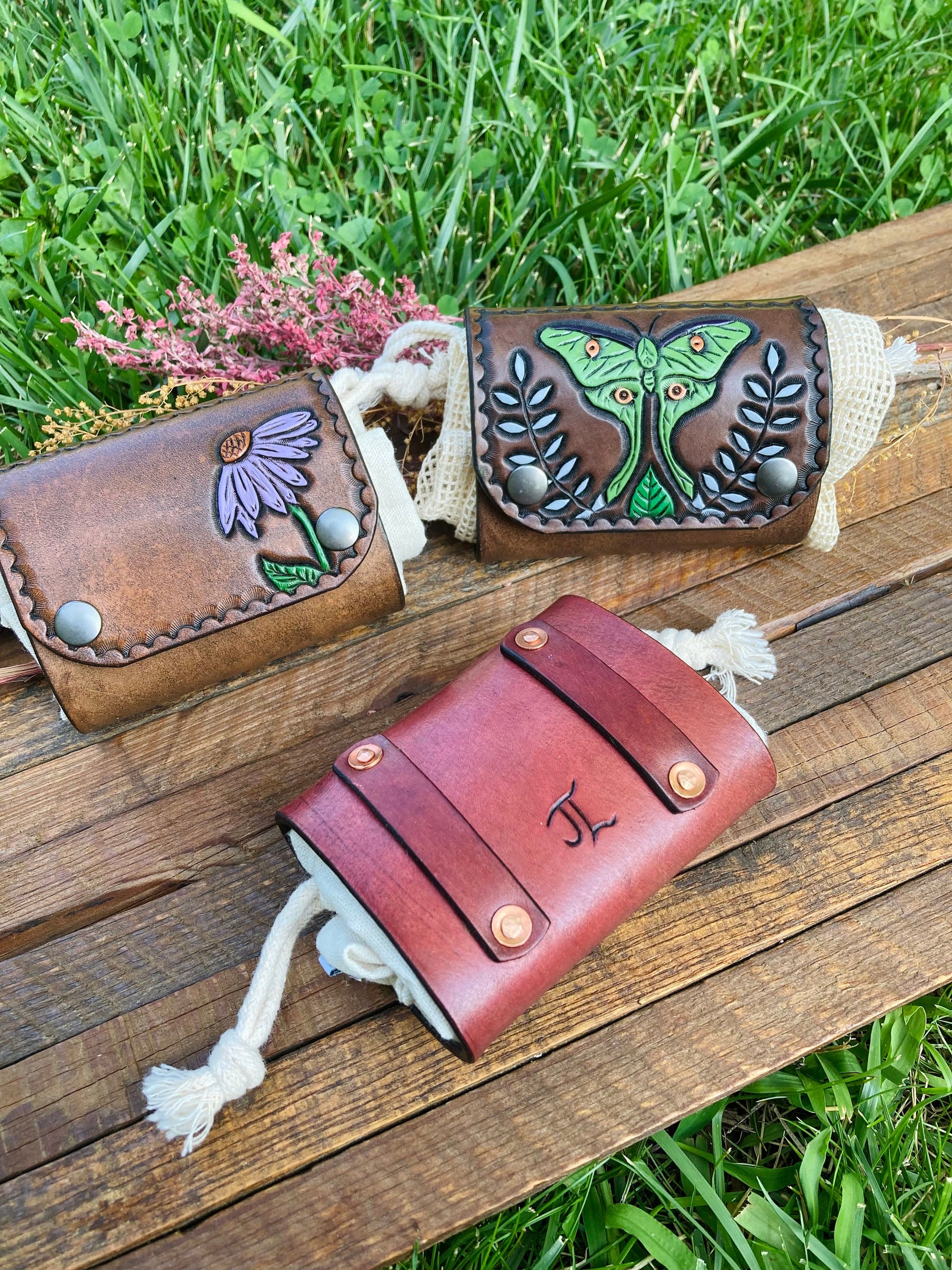 These foraging bags are cotton, wrapped and snapped inside of hand tooled and hand painted full grain leather. The cotton bag is held by 2 strong snaps & is easily detached from the leather for hand washing. Each belt bag is hand crafted and shipped from the Midwest. Choose between a dark brown or mahogany plain bag, Purple Cone Flower bag, or Luna Moth Bag Also choose between a solid cotton bag(herb/plants) and cotton mesh bag(mushrooms) All leathers dye differently, please allow slight color variations!