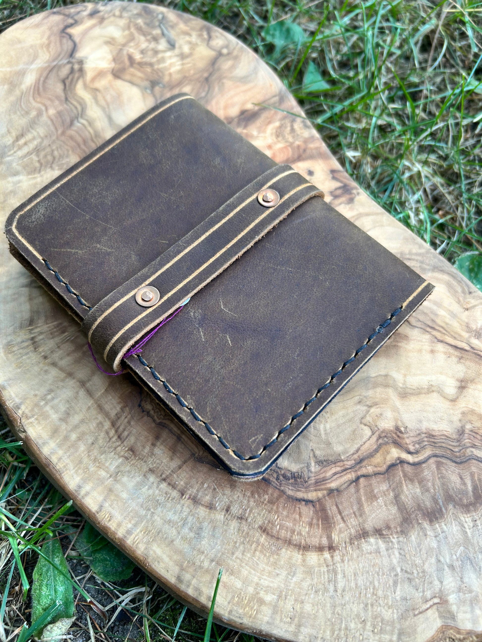 This leather journal is hand made & hand stitched. It fits a replaceable mini comp. notepad.