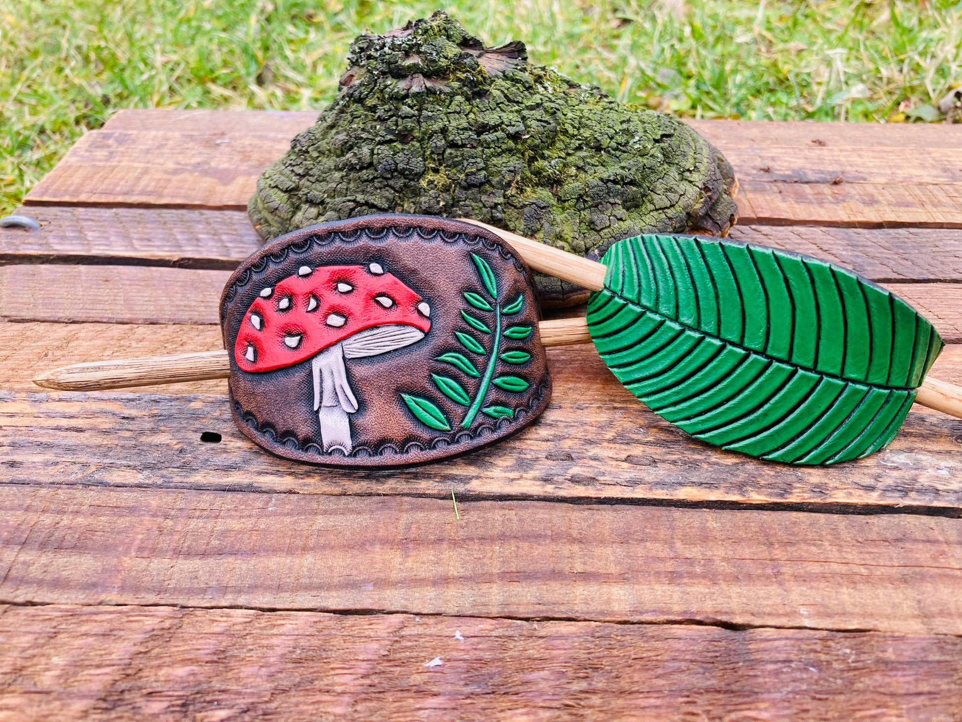 These two hair barrette’s are hand carved and tooled from full grain cowhide leather. Includes a 6” oak wooden dowel. The leather is painted by hand, lightweight, easy to put in, and strong! Choose between amanita mushroom/fern Barrett, or the the green leaf Barrett.