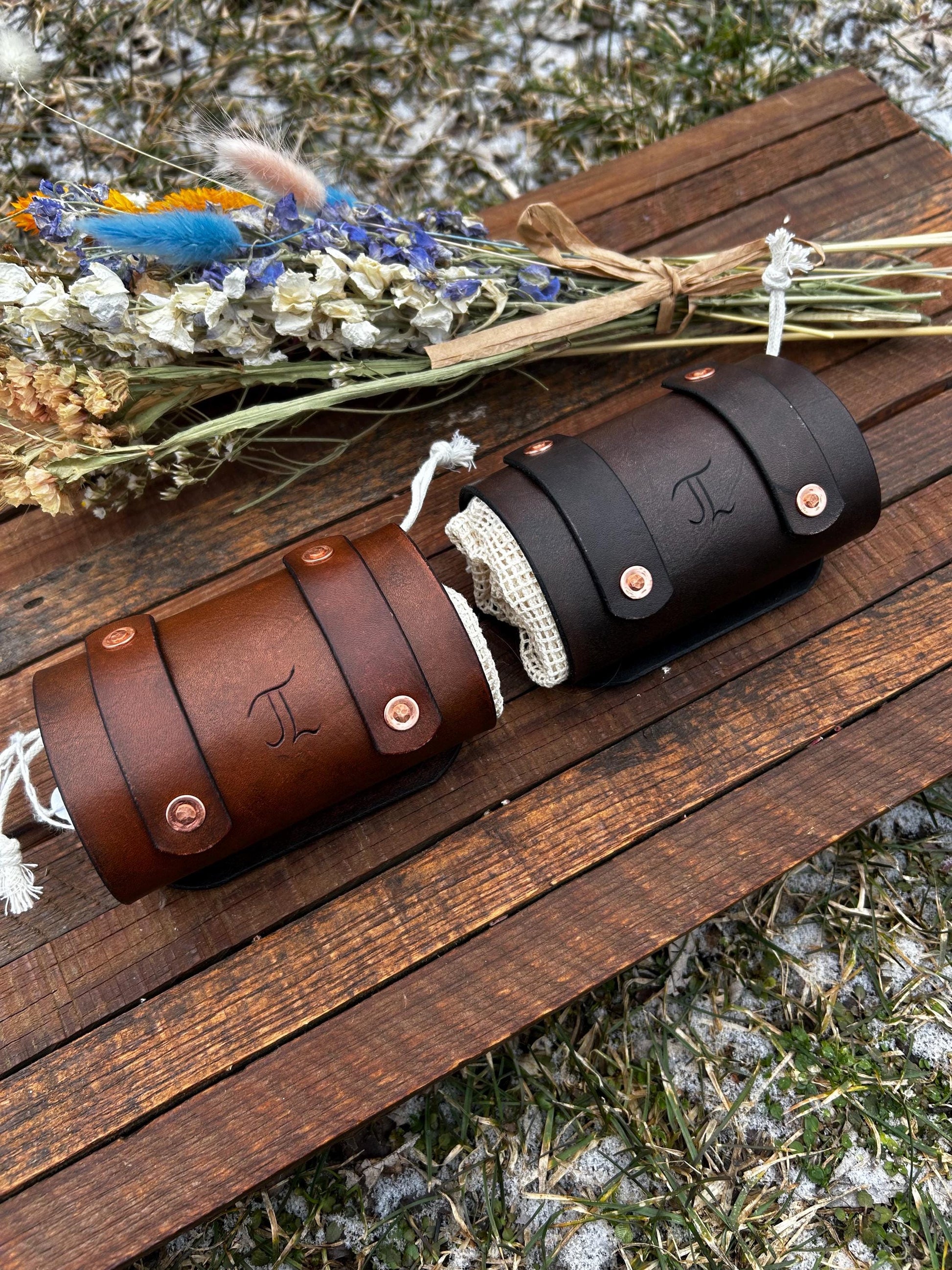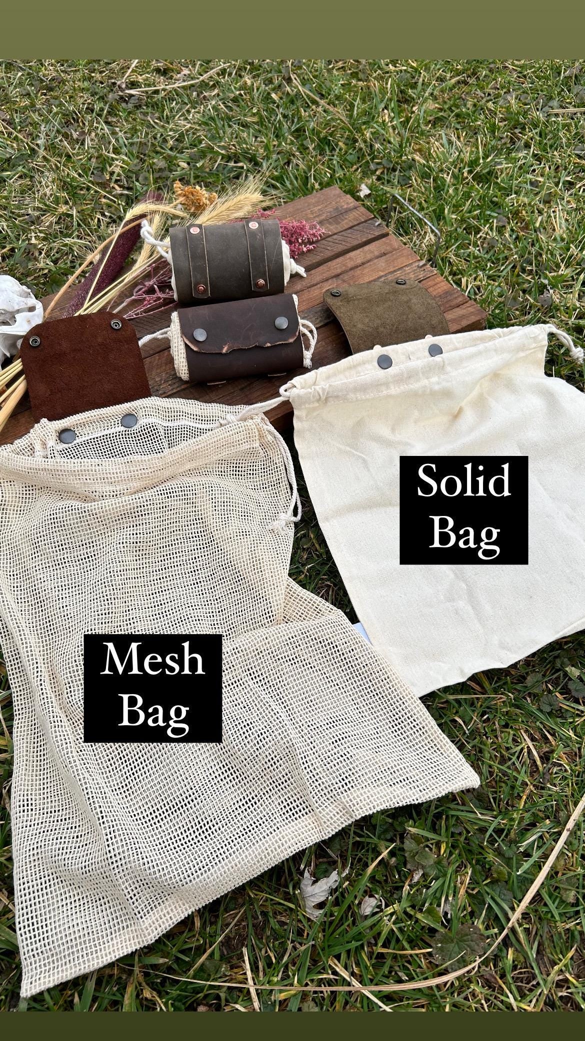 These foraging bags are cotton, wrapped and snapped inside of hand tooled and hand painted full grain leather. The cotton bag is held by 2 strong snaps & is easily detached from the leather for hand washing. (These bags are meant to hold plants/mushrooms & are not intended for heavy weight-rocks, shells, etc) Each belt bag is hand crafted and shipped from the Midwest. Choose between medium brown & dark brown background. Also choose between a solid cotton bag(herb/plants) and cotton mesh bag(mushrooms)